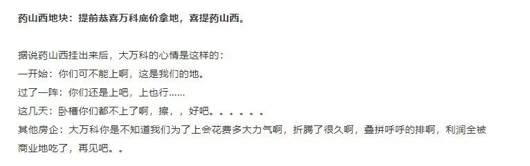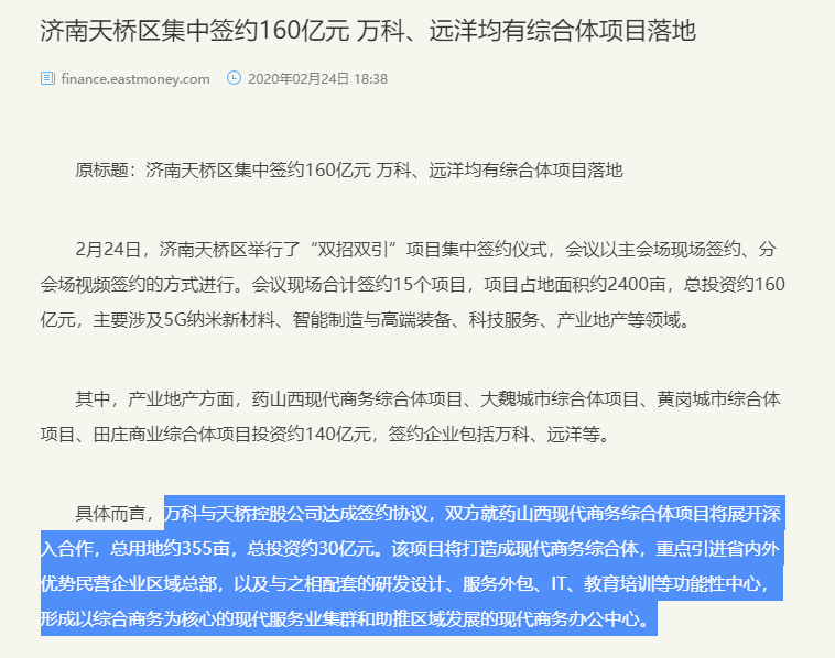 值得一提的是,今年2月份,万科曾与天桥区政府签约药山西现代商务综合体项目,项目总用地约355亩。该地块也大概率为万科竞得,至于会不会真的拿,有没有其他意外?拿的开不开心,是不是真的开心,还有待验证。