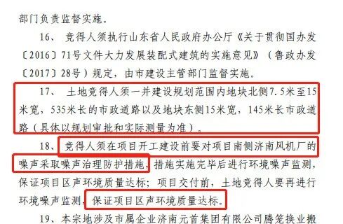 △竞得人须在项目开工建设前要对项目南侧济南风机厂的噪声采取噪声治理防护措施,措施实施完毕后进行环境噪声监测,保证项目区声环境质量达标;项目交付前,土地竞得人要再进行环境噪声监测,保证项目区声环境质量达标。