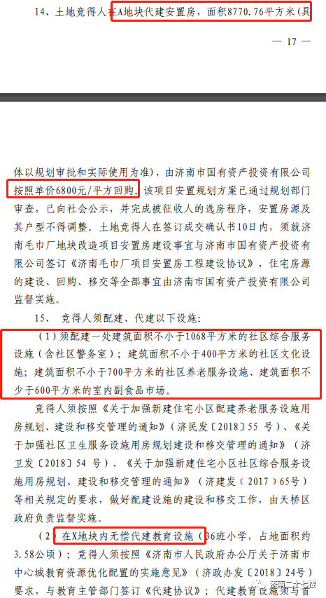 △土地竞得人在A地块代建安置房,面积8770.76平方米(具体以规划审批和实际使用为准),由济南市国有资产投资有限公司按照单价6800元/平方回购。